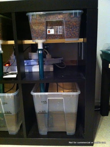 Tekniikaltaan kokoonpano on varsin yksinkertainen, molemmille kasveille on oma Eheim Compact 1000 pumppunsa, jotka ovat minimiteholle säädettynä ajastettu pumppaamaan vettä kolmen minuutin ajan kuusi kertaa päivässä. Tällöin vettä saadaan soran sekaan sen verran, ettei merkittävää liikkumista ole havaittavissa. Ylivuodot sijaitsevat järjestelmän takaosassa, ja kasvuastiat on kallistettu hivenen verran, jotta mahdollisimman paljon vettä pääsisi valumaan pois tyhjenemisen yhteydessä.